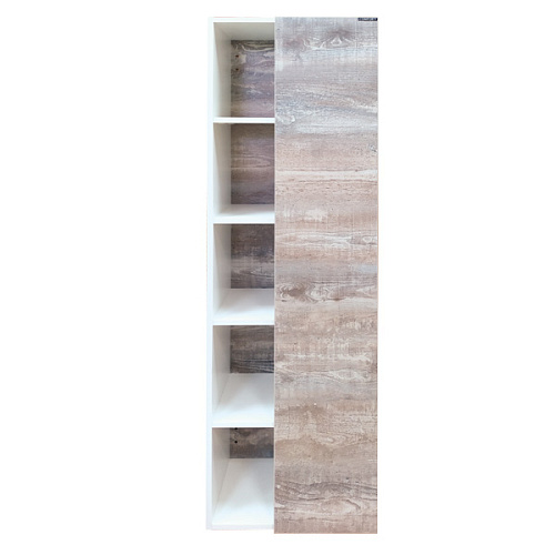 Подвесная шкаф-колонна с одной распашной дверью и пространством для открытого хранения. Створка оборудована петлями с системой плавного закрывания. За створкой три горизонтальные полки.