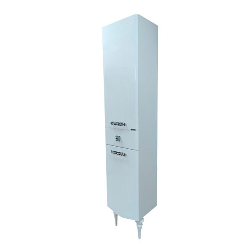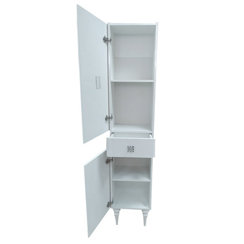Верхняя, нижняя створки и ящик оснащены системой плавного закрывания. Фасады покрыты белой глянцевой эмалью. За каждой створкой по одной горизонтальной полке