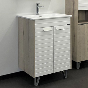Комплектация: раковина Quadro 75 (санфарфор). Подвесная тумба-умывальник с одной створкой и двумя ящиками оснащенными системой плавного закрывания. Фасады с горизонтальной фрезеровкой и покрыты белой матовой эмалью. Боковины тумбы из влагостойкого ЛДСП - дуб дымчатый.