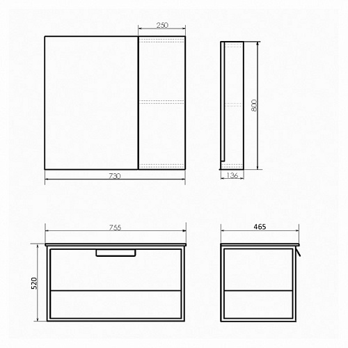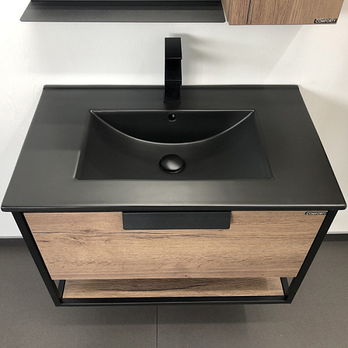 Подвесная тумба-умывальник с одним выкатным ящиком, оснащенным системой плавного закрывания и нижней полкой открытого хранения. В основе тумбы - каркас из стального профиля окрашенный черной матовой эмалью.