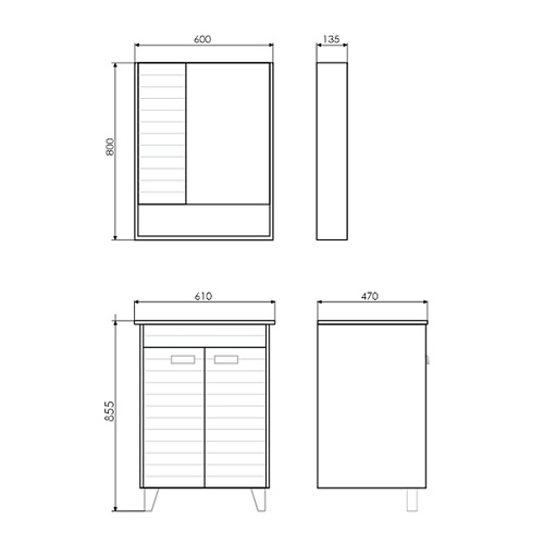 Створки оснащены петлями с плавным закрыванием. Левый узкий фасад из МДФ с фрезеровкой горизонтальными полосами. Правый широкий фасад - зеркальный. Высококачественное зеркальное полотно с амальгамой на основе серебра. Обе боковые створки шкафа открываются наружу. За широкой створкой две горизонтальные полки, за узкой одна. На нижней внешней полке можно расположить невысокие принадлежности для умывания.
