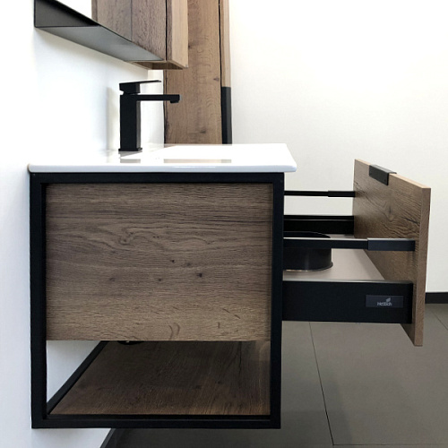 Подвесная тумба-умывальник с одним выкатным ящиком, оснащенным системой плавного закрывания и нижней полкой открытого хранения. В основе тумбы - каркас из стального профиля окрашенный черной матовой эмалью. Профильная ручка из черного металла. Керамическая раковина Sanita Luxe Quadro 90 из санфарфора. Тумба подготовлена для подключения водоснабжения снизу.