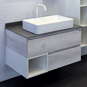 Комплектация: накладная раковина COMFORTY 78189, столешница из керамогранита. Оба ящика оснащены направляющими с функцией плавного закрывания. Тумба-умывальник выпускается в следующих сочетаниях: ВЛДСП дуб белый - серая столешница или столешница цвета антрацит; ВЛДСП дуб бежевый - бежевая столешница.