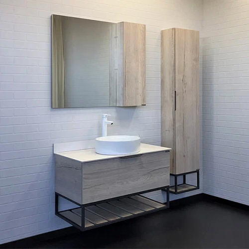Подвесная тумба-умывальник в стиле лофт Порто 90 с одним широким ящиком оснащенным системой плавного закрывания и нижней полкой открытого хранения для полотенец. В основе тумбы - каркас из стального профиля окрашенный в цвет графит серый.