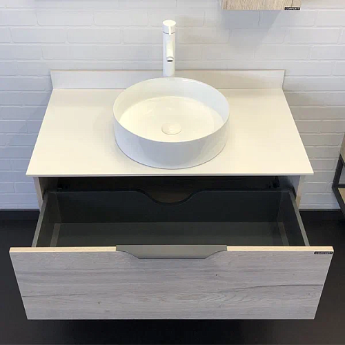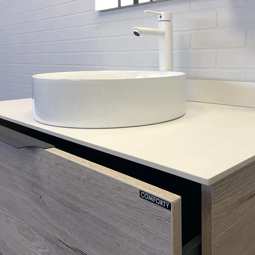 Комплектация: накладная круглая раковина Comforty 9110, столешница и пристенный бортик из белого керамогранита. Тумба подготовлена для подключения водоснабжения снизу.