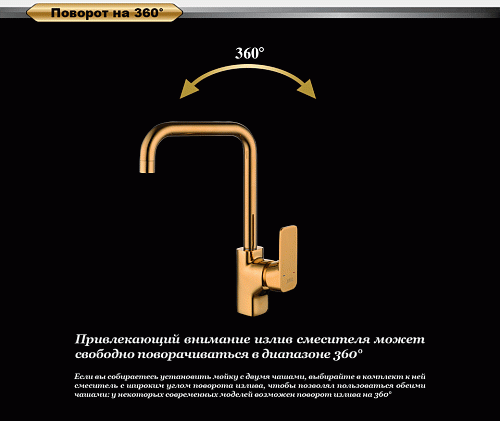 Строгие черты в богатом золотом цвете подчеркивают индивидуальность каждой кухни. Ручка и излив правильно подобраны по размеру, для удобной повседневной эксплуатации на долгие годы.
