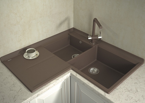 Мойка Florentina Адрия 20.380.L0960.104 960x960, кварцевый композит, 2 чаши, цвет бежевый Угловой блок с двумя вместительными чашами и просторным крылом. Эта мойка позволит максимально удобно использовать угловое пространство кухни. Конструктив мойки обеспечивает наиболее удобную и беспроблемную установку. Технические характеристики: - Цвет: бежевый. - Материал: искусственный гранит. - Монтаж: врезная. - Количество чаш: 2. - Размеры: (ШхГхВ), мм 960х960х243. - В комплекте: отводная арматура с выпуском D=90 мм и переливом.