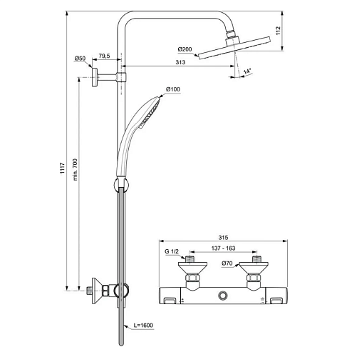 CERATHERM T25 Душевая система в комплекте с термостатическим смесителем для душа (монтаж на стандартных эксцентриках, термостатический картридж IS, новая технология, затворы на керамических дисках G1/2, технология "Cool body" ("Холодный корпус"), пластиковые рукоятки с ограничителями температуры и потока воды (50%), встроенный обратный клапан), пластиковый верхний душ 200 мм, ограничение потока 12 л/мин. 3-функциональная душевая лейка Idealrain 100 мм с ограничением потока 8 л/мин. регулируемое по вертикали верхнее крепление к стене, шланг 1600 мм Idealflex.