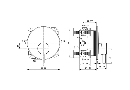 CERALINE Встраиваемый смеситель для душа, комплект №2 (функциональный комплект и накладка для настенного монтажа), картридж 47 мм функцией HWTC (ограничение максимальной температуры горячей воды), с функцией CLICK (ограничение потока воды), металлическая рукоятка с индикаторами горячей/холодной воды, металлическая накладка, для монтажа с комплектом EASY-BOX A1000NU (заказывается дополнительно).