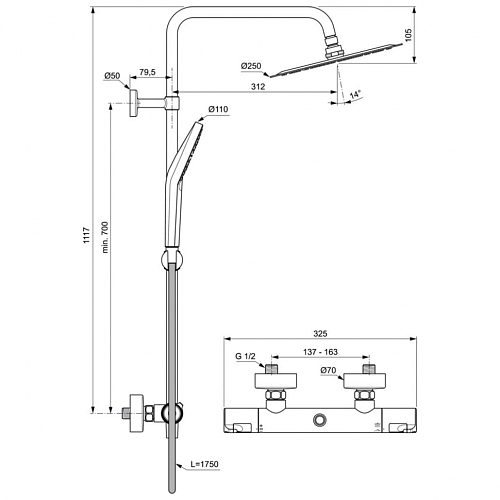 CERATHERM T50 Душевая система в комплекте с термостатическим смесителем для душа (монтаж на стандартных эксцентриках, термостатический картридж IS, новая технология, затворы на керамических дисках G1/2, технология "Cool body" ("Холодный корпус"), металлические рукоятки с ограничителями температуры и потока воды (50%), встроенный обратный клапан), металлический верхний душ 250 мм, ограничение потока 12 л/мин, 3-функциональная душевая лейка Idealrain Evo Navigo 110 мм с ограничением потока 8 л/мин. насадки против известкового налета, шланг 1750 мм Idealflex, регулируемая высота настенного кронштейна.