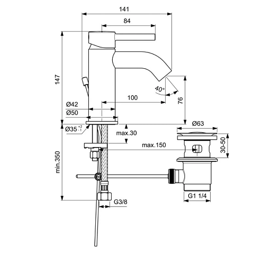 CERALINE Однорукоятковый смеситель для умывальника, картридж 28 мм FirmaFlow с функцией HWTC (ограничение максимальной температуры горячей воды), гибкая подводка G3/8", система монтажа EASY-FIX (облегченный монтаж), аэратор Cashe с ограничением потока 5 л/мин. металлическая рукоятка с индикаторами горячей/холодной воды, металлический донный клапан.