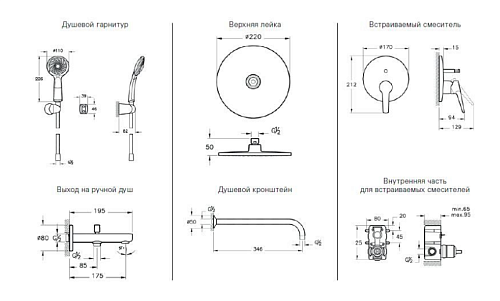 Оснащение Смеситель встроенный внешняя и внутренняя часть, верхний душ, душевая лейка, кронштейн для верхнего душа, излив, внутрення часть для встроенных душевых систем.