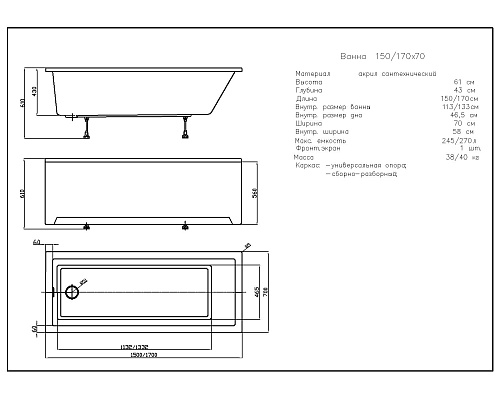 Оснащение • ванна акриловая • каркас (или Универсальная опора), слив-перелив, фронтальный и боковой экраны в комплект не входят и поставляются отдельно • установка гидромассажного оборудования не предусмотрена