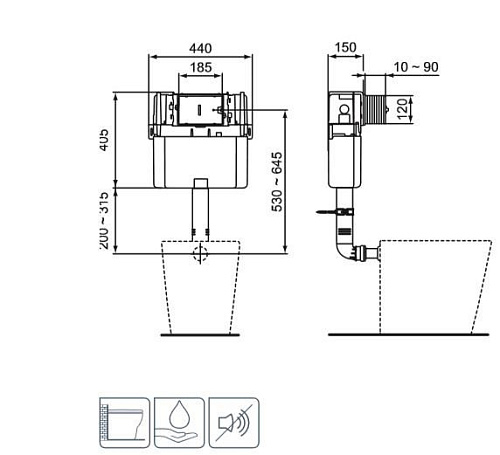 PROSYS 150 M Встраиваемый бачок для напольных унитазов для встраивания в капитальную стену, для комбинации с напольными унитазами. Минимальная толщина 150 мм. С фронтальным или горизонтальным механическим управлением. Возможно пневматическое или электронное управление при помощи переходников, приобретаемых дополнительно. Двойной смыв, пред-установка 6/3 л. Три варианта объема смыва с возможностью быстрой регулировки - 4/2, 6/3 или 7/3 л. Полипропиленовый бачок, устойчивый к термальным перепадам; прокладка против конденсата в комплекте. Технология SmartValve позволяет экономить до 9 л воды в день; маркировка CE EN 14055 CL1; тихий клапан, соответствующий стандарту NF, категория Class I; толщина бачка 150 мм; 6 возможных точек монтажа клапана подключения воды.