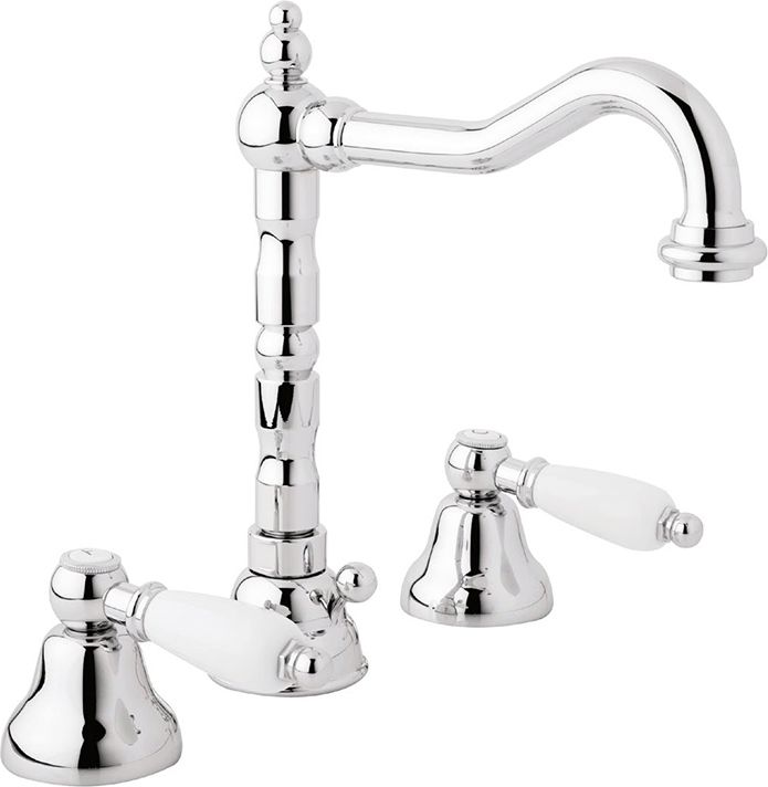 Смеситель для умывальника с установкой на три отверстия с донным клапаном, высокий (17 см) поворотный излив, керамические кранбуксы 90', керамические рукоятки управления водой
