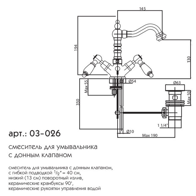 Смеситель для умывальника с донным клапаном, с гибкой подводкой 1/2" - 40 см, низкий (13 см) поворотный излив, керамические кранбуксы 90', керамические рукоятки управления водой