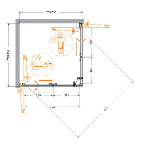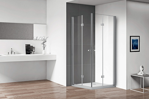 Душевой уголок, квадратный и прямоугольный. Тип дверей: две складные двери. Стекло: 6 мм, прозрачное. Исполнение: хром. Поддон и барьер приобретаются отдельно.