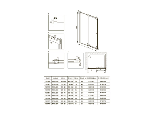 Толщина закаленного стекла: 6. Монтаж: для комплектации с walk-in KTS. Покрытие Active Cover: да. Дверь может использоваться как отдельный элемент для ниши или как часть системы Kerria Plus. Гидрофобное покрытие Active-Cover, которое облегчает стекание воды со стекла. Маскировка элементов для монтажа. Прозрачное стекло TOTALWHITE. Безопасное и прочное закаленное стекло. Специальное средство, безопасное для очищаемых поверхностей. Возможность использования специального препарата Active Cover. Реверсивная дверь, позволяющая установить кабину с правой или левой стороны. Профильная система позволяет уменьшить кривизну стен. Только лучшие материалы, качество которых подтверждено лабораторными испытаниями. Стойкость к ударам, химическим веществам и окрашиванию в соответствии со стандартом PN-EN 14428+A1:2008, подтверждена испытаниями Института керамики и строительных материалов.