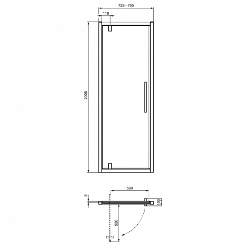 I.LIFE PV Реверсивная распашная панель-дверь 75 см для установки в нишу. Высота 200 см, безопасное прозрачное стекло 8 мм, антиизвестковое покрытие Ideal Clean, алюминиевый профиль Bright silver (толщина 1,2 мм), стальная ручка 300 мм, двойные верхние ролики, система быстрого отсоединения снизу, регулировка профиля до 20 мм, скрытые винты, прозрачные уплотнители, поворотный штифт со вставленным шарниром для установки в стеклянную панель. Может комбинироваться с любым поддоном соответствующего размера, а также может устанавливаться без поддона на плиточный пол. Возможно комбинировать с фиксированной боковой панелью L (только в качестве второй стороны ограждения).