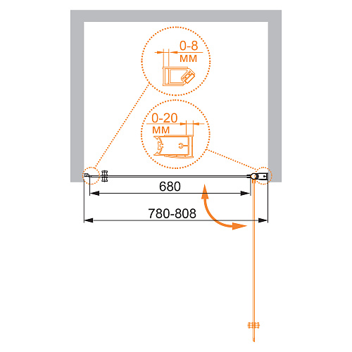 Дверь в проем Тип дверей: одна распашная дверь. Стекло: 6 мм, прозрачное или текстурное Punto. Исполнение: хром. Поддон: тип А или барьер тип В. Поддон и барьер приобретаются отдельно. Особенности: * улучшенная герметичность за счёт петли с функцией подъема двери; * белый магнитный уплотнитель дверей; * цилиндрическая конструкция петли позволяет открывать дверь на 180º.