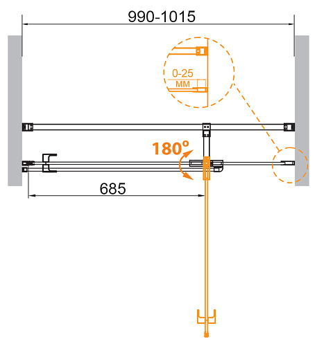 Дверь в проем. Тип дверей: одна распашная. Стекло: 8 мм. Исполнение: хром. Поддон: возможность комплектации поддонами типа А, AH ( поддон приобретается отдельно) Особенности: петли из нержавеющей стали, ход петли 270*, открывание в обе стороны, регулировка ширины предусмотрена за счет боковых профилей.