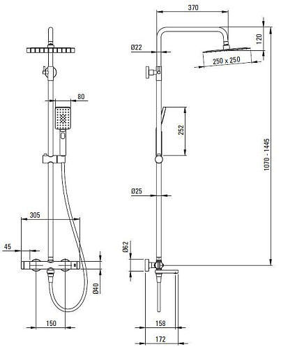 Регулируемая высота верхнего душа: да. Регулировка высоты штанги для [мм]: 1070. Регулировка высоты штанги для [мм]: 1445. Форма верхнего душа: квадратный. Ширина [мм]: 250. Длина [мм]: 250. Толщина [мм]: 55. Anti-calc: да. Количество функций: 1. Виды струи: дождевой. Быстрое время отклика на включение и выключение воды: да. Количество функций лейки: 3. Виды струи: дождевой, водяной туман, смешанный. Вид оплетки шланга: не касается. Материал оплетки: PVC. Anti_twist: 2. Вид излива: складная. Тип переключателя: механический, керамический. Вид смесителя: двухрычажный, термостатический. Регулировка угла наклона душевой лейки. Специальное средство, безопасное для очищаемых поверхностей.