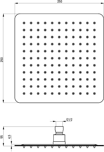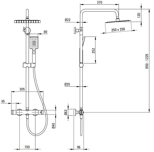 Регулировка высоты штанги для [мм]: 850. Регулировка высоты штанги для [мм]: 1225. Форма верхнего душа: квадратный. Ширина [мм]: 250. Длина [мм]: 250. Anti-calc: да. Количество функций 1. Виды струи: дождевой. Количество функций лейки: 3. Вид оплетки шланга: не касается. Материал оплетки: PVC. Anti_twist: 1. Тип переключателя: механический, керамический. Вид смесителя: двухрычажный, термостатический. Инновационное, прочное и легко очищаемое титановое покрытие. Регулировка угла наклона душевой лейки. Специальное средство, безопасное для очищаемых поверхностей.