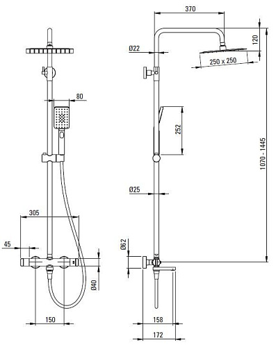 Регулируемая высота верхнего душа: да. Регулировка высоты штанги для [мм]: 1070. Регулировка высоты штанги для [мм]: 1445. Вид излива: складная. Тип переключателя: механический, керамический. Вид смесителя: двухрычажный, термостатический. Сочетание функциональности и эстетики. Эргономичные ручки позволяют легко регулировать поток воды. Усиленные обратные клапаны компенсируют скачки напряжения. Блокировка температуры 38?C для предотвращения ожогов. Высококачественная латунь. Инновационное и простое в уходе покрытие - брашированная сталь. Подвижный силиконовый аэратор облегчает удаление известковых отложений. Подвижный излив, который также является переключателем функций. Ультратонкая стальная головка. Система Anti-calc для легкого удаления известковых отложений. Лейка с системой Anti-calc облегчает удаление известкового налета. Регулировка угла наклона душевой лейки. Только лучшие материалы, качество которых подтверждено лабораторными испытаниями. Предложение включает чистящее средство для арматуры всех цветов.