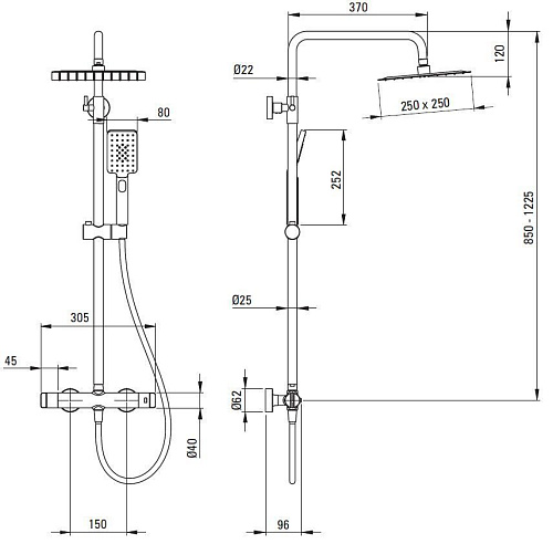 Регулируемая высота верхнего душа: да. Регулировка высоты штанги для [мм]: 850. Регулировка высоты штанги для [мм]: 1225. Ширина [мм]: 250. Длина [мм]: 250. Anti-calc: да. Количество функций: 1. Виды струи: дождевой. Количество функций лейки: 3. Вид оплетки шланга: не касается. Материал оплетки: PVC. Anti_twist: 1. Тип переключателя: механический, керамический. Вид смесителя: двухрычажный, термостатический. Регулировка угла наклона душевой лейки. Специальное средство, безопасное для очищаемых поверхностей.