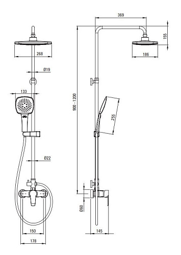 Регулируемая высота верхнего душа: да. Регулировка высоты штанги для [мм]: 900. Регулировка высоты штанги для [мм]: 1200. Добавочные свойства: регулировка наклона душевой лейки. Форма верхнего душа: прямоугольный. Материал: ABS. Ширина [мм]: 268. Длина [мм]: 186. Толщина [мм]: 14. Anti-calc: да. Количество функций: 2. Виды струи: дождевой, гидромассаж. Количество функций лейки: 3. Виды струи: дождевой, гидромассаж, смешанный. Вид оплетки шланга: двойное плетение. Тип переключателя: механический, керамический. Вид смесителя: смешивающий. Штанга изготовлена ??из стали. Только лучшие материалы, качество которых подтверждено лабораторными испытаниями. Система Anti-calc для легкого удаления известковых отложений. Специальное средство, безопасное для очищаемых поверхностей. Регулируемая высота верхнего душа. Корпус смесителя изготовлен из латуни высочайшего качества.
