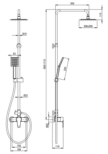 Регулируемая высота верхнего душа: да. Регулировка высоты штанги для [мм]: 900. Регулировка высоты штанги для [мм]: 1115. Добавочные свойства: регулировка наклона душевой лейки. Форма верхнего душа: квадратный. Ширина [мм]: 200. Длина [мм]: 200. Толщина [мм]: 55. Anti-calc: да. Количество функций: 1. Виды струи: дождевой. Быстрое время отклика на включение и выключение воды: да. Количество функций лейки: 1. Вид оплетки шланга: двойное плетение. Тип переключателя: механический, керамический. Вид смесителя: смешивающий, однорычажный. Штанга изготовлена ??из стали. Только лучшие материалы, качество которых подтверждено лабораторными испытаниями. Лейка с системой Anti-calc облегчает удаление известкового налета. Специальное средство, безопасное для очищаемых поверхностей. Регулируемая высота верхнего душа. Корпус смесителя изготовлен из латуни высочайшего качества.