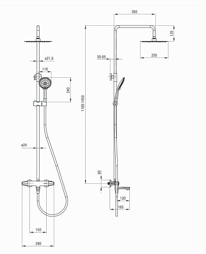 Регулируемая высота верхнего душа: да. Регулировка высоты штанги для [мм]: 1110. Регулировка высоты штанги для [мм]: 1450. Добавочные свойства: регулировка наклона душевой лейки. Форма верхнего душа: круглый. Толщина верхнего душа [мм]: 55. Диаметр верхнего душа [мм]: 250. Anti-calc: да. Количество функций: 1. Виды струи: дождевой. Быстрое время отклика на включение и выключение воды: да. Количество функций лейки: 3. Виды струи: дождевой, гидромассаж, смешанный. Вид оплетки шланга: не касается. Материал оплетки: PVC. Anti_twist: 2. Вид излива: складная. Вид смесителя: термостатический, двухрычажный.