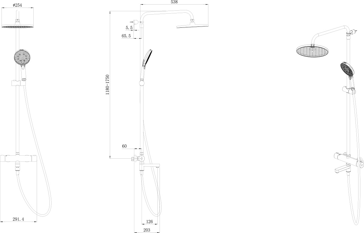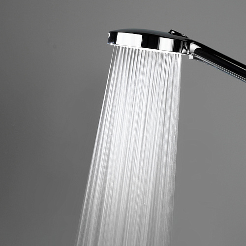 Верхний душ и ручная лейка имеют форму круга. Стойка выполнена из нержавеющей стали, круглая в сечении. У ручной лейки предусмотрены четыре режима потока. Регулировка высоты при установке — 1180-1750 мм.