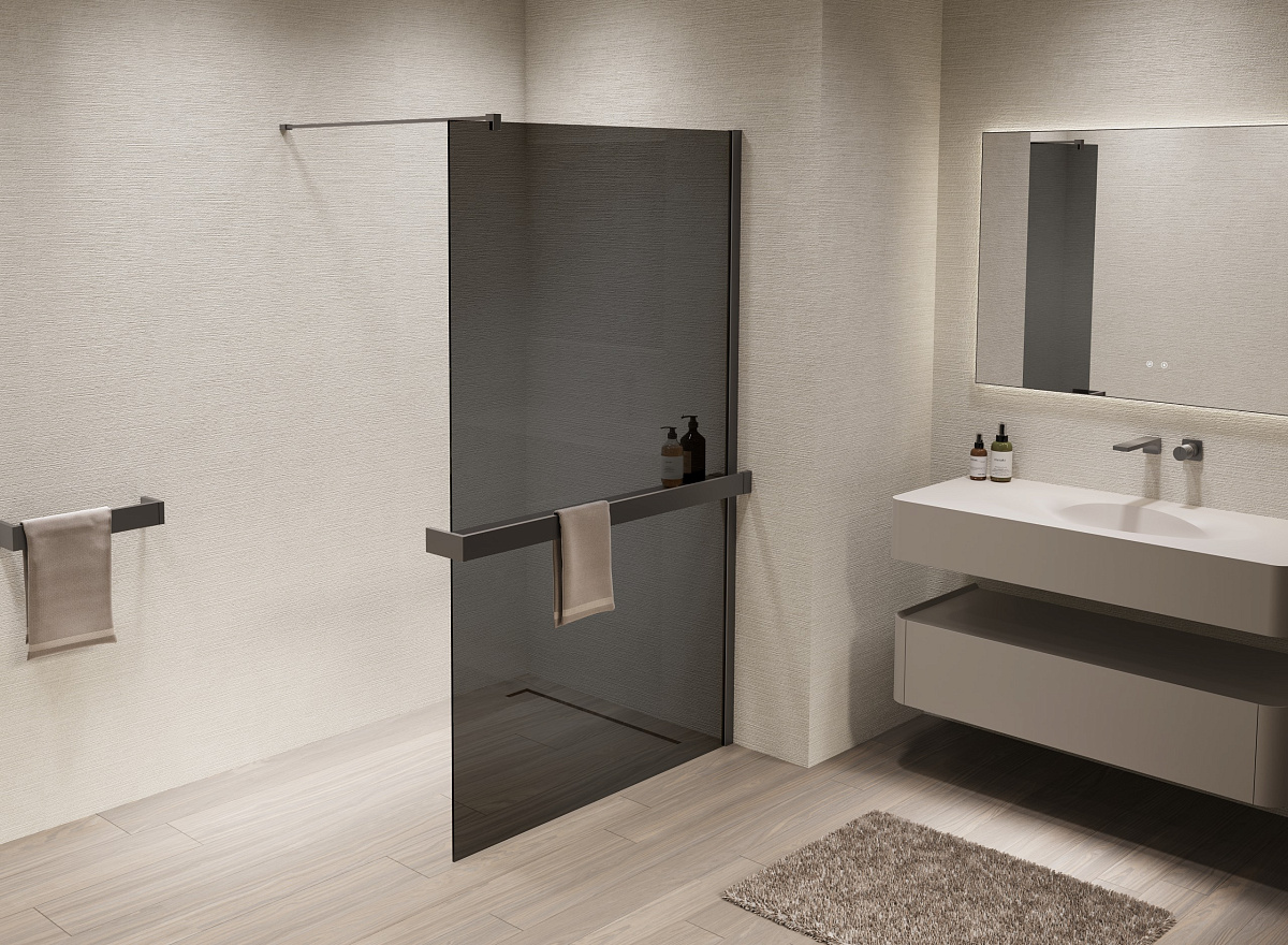 Душевая перегородка с полкой и полотенцедержателем Максимальная длина держателя кронштейна – 1200мм Длина полки с полотенцедержателем – 1400мм