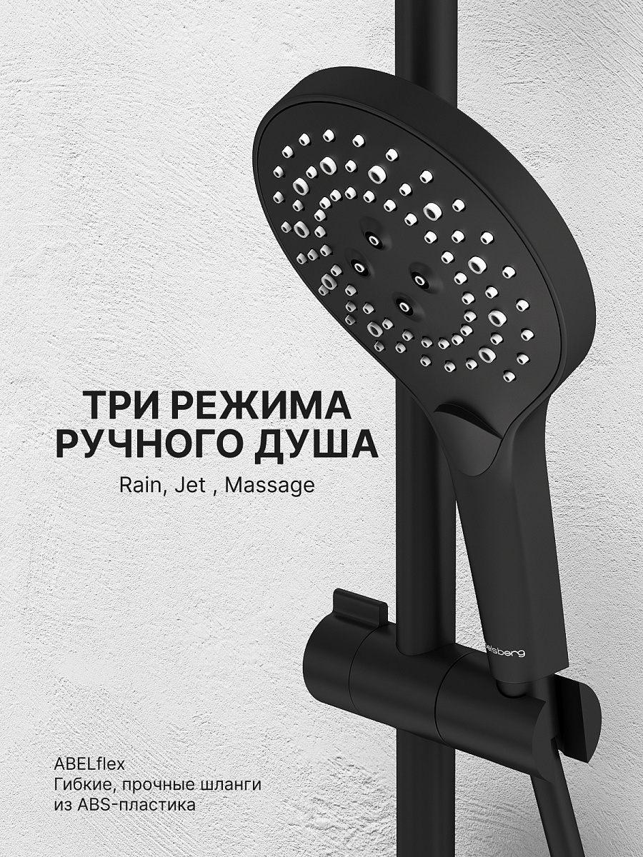 Душевая система Abelsberg Intensa — это выбор для тех, кто не боится выразительности в интерьере. Динамичные линии, продуманные пропорции и мощный визуальный импульс превращают душевую систему в главный акцент ванной комнаты. Интегрированный излив для ванны и круглый тропический душ делают её универсальным решением для повседневного комфорта. Система объединяет стиль и функциональность: каждый элемент продуман до мелочей — от формы переключателя до ощущений от струи воды.
