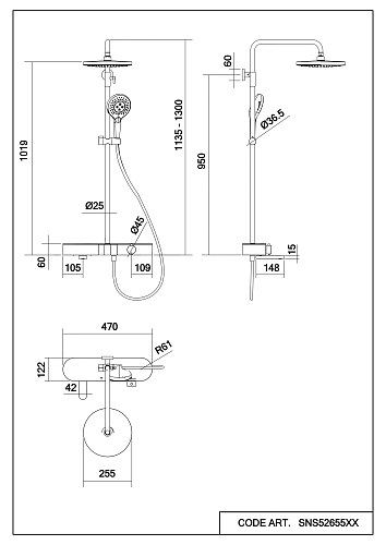 Оснащение Смеситель, штанга для душа, шланг для душа, верхний душ, ручной душ, эксцентрики