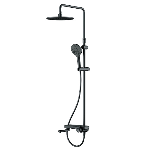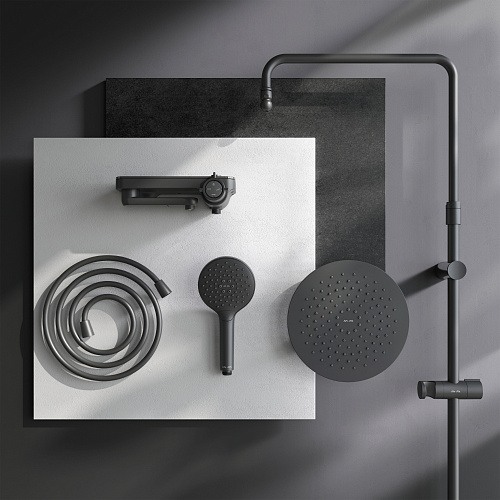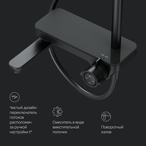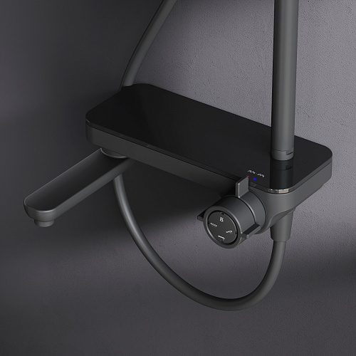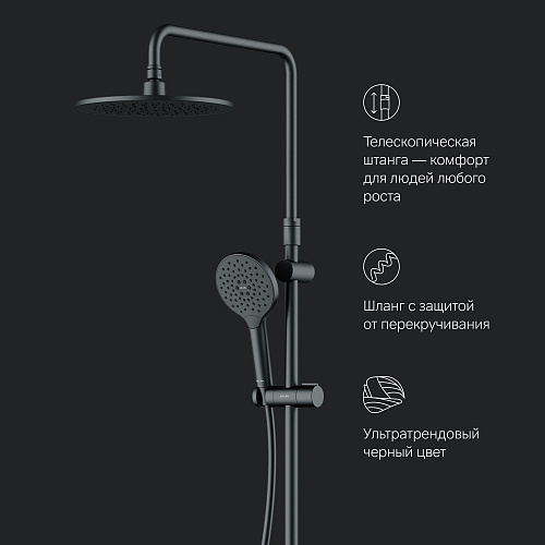 Тотальный дизайн в действии: все детали душевой системы – от пропорций ручного и верхнего душей до рисунка расположения форсунок на лейках. Премиальные размеры и продуманные детали: увеличенный диаметр душевых леек (верхний душ 220 мм и ручной душ 120 мм) позволит ощутить преимущества тропического душа тогда как увеличенная длина шланга 1750 мм обеспечит свободу движений во время принятия душа. Телескопическая поворотная штанга регулируется по высоте в диапазоне от 1030 до 1460 мм, обеспечивая комфорт для людей любого роста, а шаровой шарнир в держателе верхнего душа позволяет регулировать угол его наклона. Смеситель выполнен в виде полочки. Чистый дизайн без лишних деталей: переключатель расположен за ручкой настройки температуры и позволяет менять источник потока воды от ручной лейки и излива до верхнего душа.