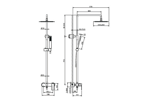 Материал корпуса - латунь на 2 потребителя Картридж Sedal 35 мм (Испания) Душевая колонна из нерж. φ23 мм Верхний душ из нерж. 250*250*2 мм Ручной душ из латуни 1 функц. Шланг для душа из нерж 1,5 м Преключатель - керамический дивертор Упакован в цветн. коробку со вставками из пены ПВХ