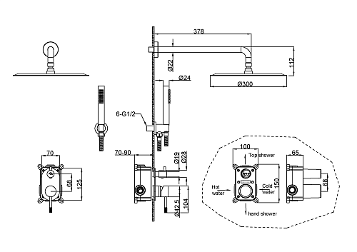 Смеситель встроенный + верхний+ ручной душ Boheme Uno Черный Золото