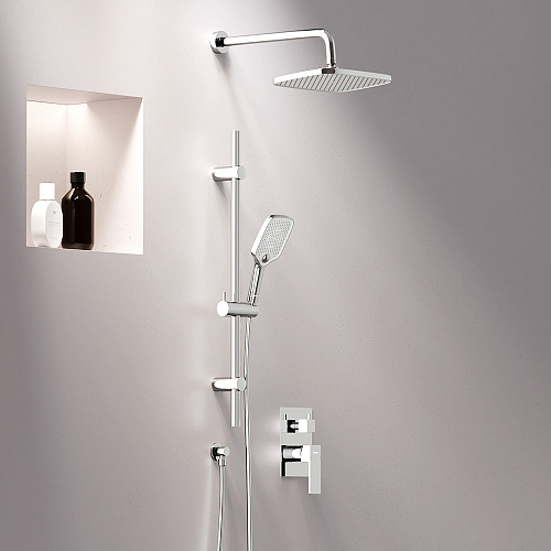 Душевая система Gala обладает мягкими геометричными формами которые идеально впишутся в современную ванную комнату. Простая и минималистичная на первый взгляд она чрезвычайно функциональна и удовлетворит даже самого искушенного пользователя. А полностью скрытые коммуникации освободят дополнительное пространство для реализации самых смелых дизайнерских идей. Настоящее SPA прямо у вас дома: увеличенный размер тропической лейки с регулируемым углом наклона и 3 режима ручного душа сделают ваши ежедневные ритуалы незабываемыми. Простота и минимализм во всем: переключайте потоки воды между ручной тропической лейкой и изливом плавным поворотом дивертора. Инновационное покрытие High Gloss гарантирует чрезвычайную прочность душевой системы надежно защищая хромовую поверхность от механических повреждений коррозии и потери цвета. ""