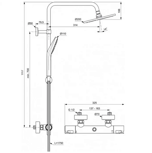 CERATHERM T50 Душевая система в комплекте с термостатическим смесителем для душа. Монтаж на стандартных эксцентриках. Термостатический картридж IS, новая технология. Затворы на керамических дисках G1/2 180°. Технология «Cool body» («Холодный корпус»). Металлические рукоятки с ограничителями температуры (40?C) и потока воды (50%). Встроенный обратный клапан. Металлический верхний душ 200 мм, ограничение потока 12 л/мин. 3-функциональная душевая лейка Idealrain Evo Round 110 мм, ограничение потока 8 л/мин. Регулируемое по вертикали верхнее крепление к стене. Шланг 1750 мм Idealflex.