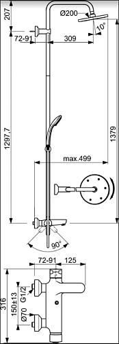 IDEALRAIN ECO SL Душевая система со смесителем для ванны/душа CONNECT (с функциями CLICK и HWTC (ограничение горячей воды)), литой излив, металлическая рукоятка, 3-функциональный керамический переключатель, поворот рукоятки 360° с четкой фиксацией каждой позиции, скрытый монтаж, эксцентрики с шумопонижателями, удлиненная душевая труба (1298 мм) 25 мм для верхнего душа, пластиковый слайдер с кнопкой, металлические крепления к стене, регулируемое верхнее крепление, пластиковый верхний душ 200 мм, ограничение потока 12 л/мин, шаровое соединение, 3-функциональная душевая лейка 80 мм (ограничение потока 8 л/мин.), металлический шланг 1500 мм, обратный клапан.