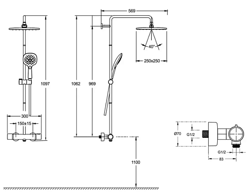 Оснащение Металлическая розетка, Эксцентрики, Душевой шланг, Душевая лейка, Держатель для душевой лейки, Верхний душ, Кронштейн, Штанга душевая, Термостат