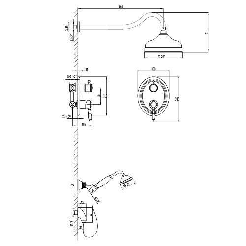 Оснащение Душевой шланг, душевая лейка, переключатель потоков, кронштейн для верхнего душа