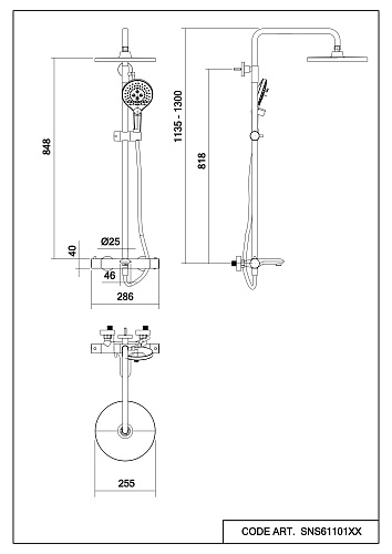 Оснащение Смеситель, штанга для душа, шланг для душа, верхний душ, ручной душ, эксцентрики