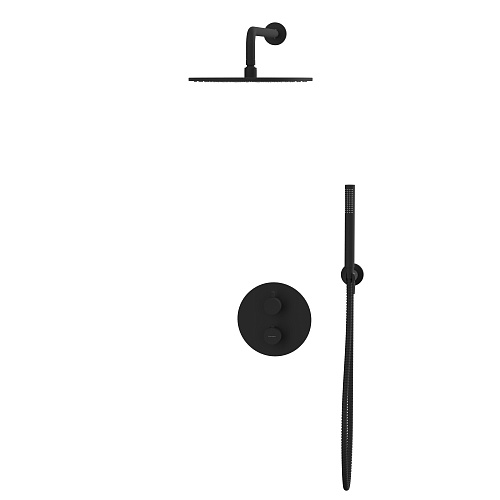 - запорно-переключающий вентиль; - верхний душ D=300 мм: латунь; - длина кронштейна верхнего душа 395 мм: латунь; - душевой шланг в металлической оплетке; - длина шланга 150 см; - ручной душ, 1 режим: латунь; - встраиваемая часть смесителя в комплек
