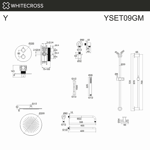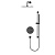 - запорно-переключающий вентиль; - верхний душ D=300 мм: латунь; - длина кронштейна верхнего душа 395 мм: латунь; - душевой шланг в металлической оплетке; - длина шланга 150 см; - высота штанги ручного душа 720 мм: латунь; - ручной душ, 1 режим: лат