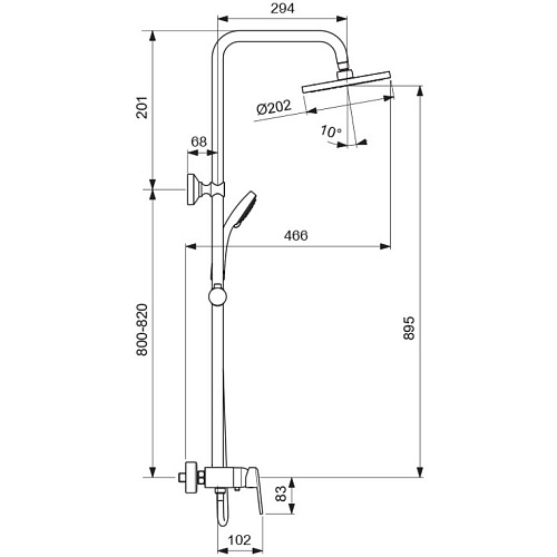 Оснащение Душевой шланг, душевая лейка, держатель для душевой лейки, душевая штанга, верхний душ, смеситель, кронштейн.