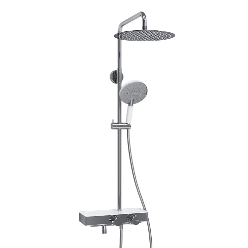 Характеристики: Напор воды не регулируется. Рекомендуем установку понижающих давление редукторов. Входит в комплект: - Душевая насадка ? 300 мм, 168 форсунок, нержавеющая сталь; - Стойка для душа, ? 24 мм регулируемая по высоте; - Лейка 3-функциональная с системой защиты от известковых отложений; - Шланг ПВХ 1500 мм, подключение к лейке; - Термостатический смеситель; - Термостатический картридж Vernet (Франция); - Встроенный пластиковый аэратор Neoperl HONEYCOMB (Германия) с регулируемым углом накло- на струи; - Обратный клапан Neoperl (Германия); - Керамический поворотный переключатель; - Набор для монтажа.