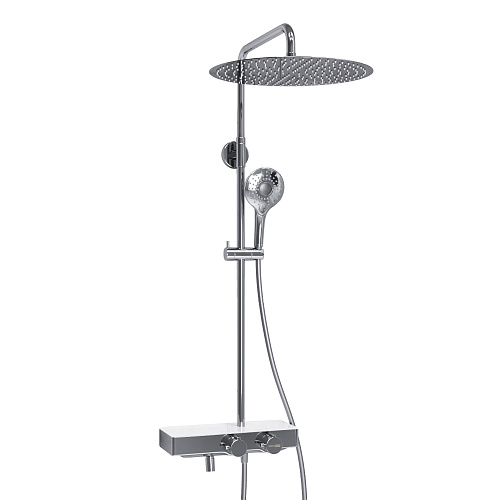 Характеристики: Напор воды не регулируется. Рекомендуем установку понижающих давление редукторов. Входит в комплект: - Душевая насадка ? 400 мм, 248 форсунок, нержавеющая сталь; - Стойка для душа, ? 24 мм регулируемая по высоте; - Лейка 3-функциональная с системой защиты от известковых отложений; - Шланг ПВХ 1500 мм, подключение к лейке; - Термостатический смеситель; - Термостатический картридж Vernet (Франция); - Встроенный пластиковый аэратор Neoperl HONEYCOMB (Германия) с регулируемым углом накло- на струи; - Обратный клапан Neoperl (Германия); - Керамический поворотный переключатель; - Набор для монтажа.